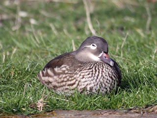 As I arrived back at the car, a pair of Mandarins were on the opposite bank of a stream. The female was having a doze...