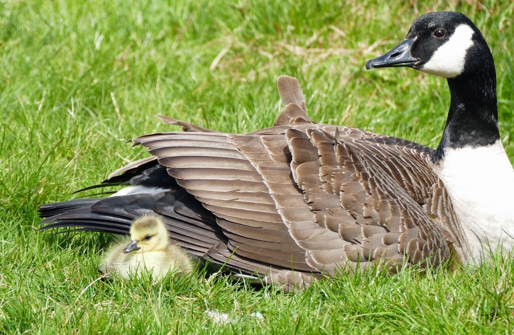 and after a walk via the bird feeders, Marsh and Coal Tit seen... we caught up with a family of Canada Geese... there were 7 Goslings.. most hiding under Mum's wing to begin with